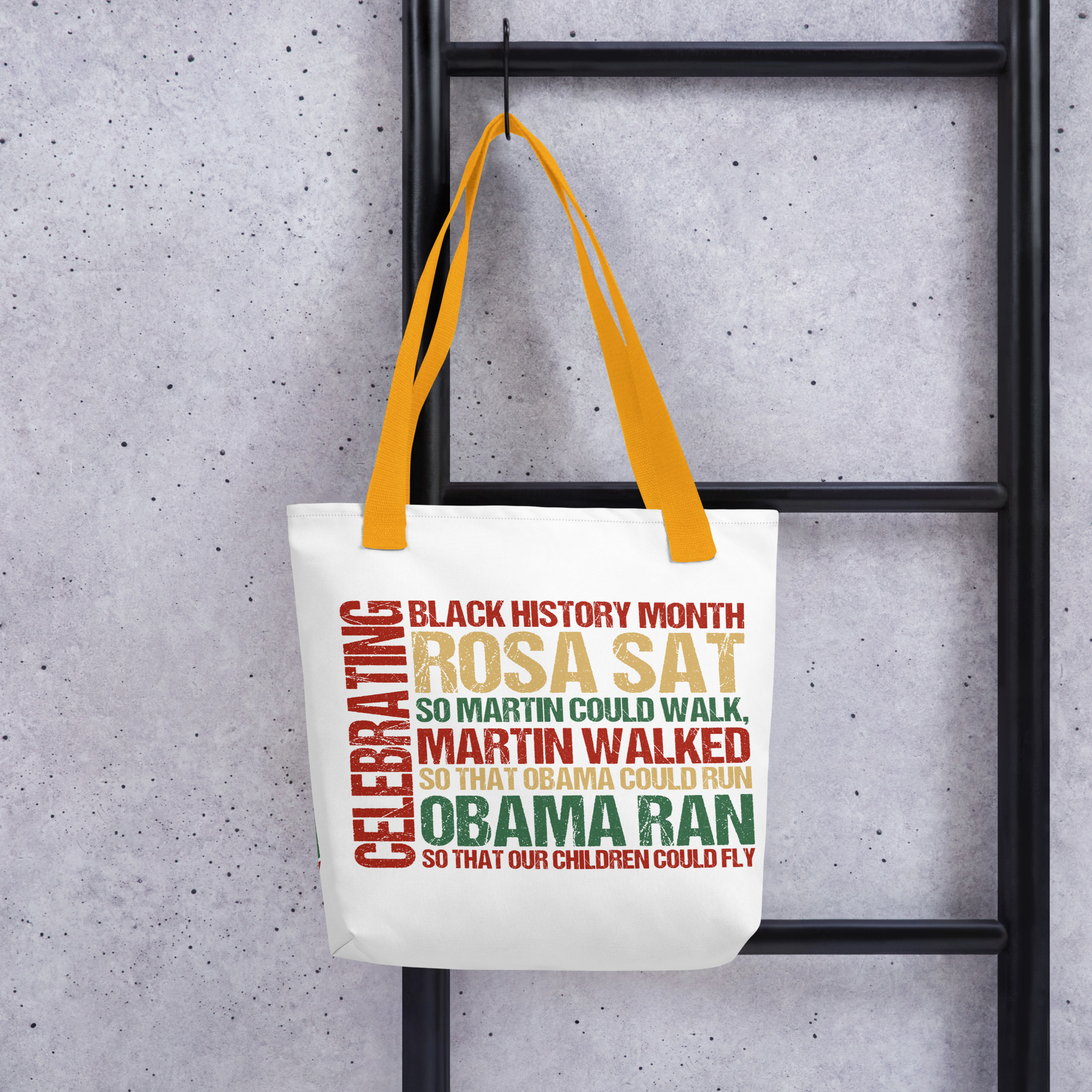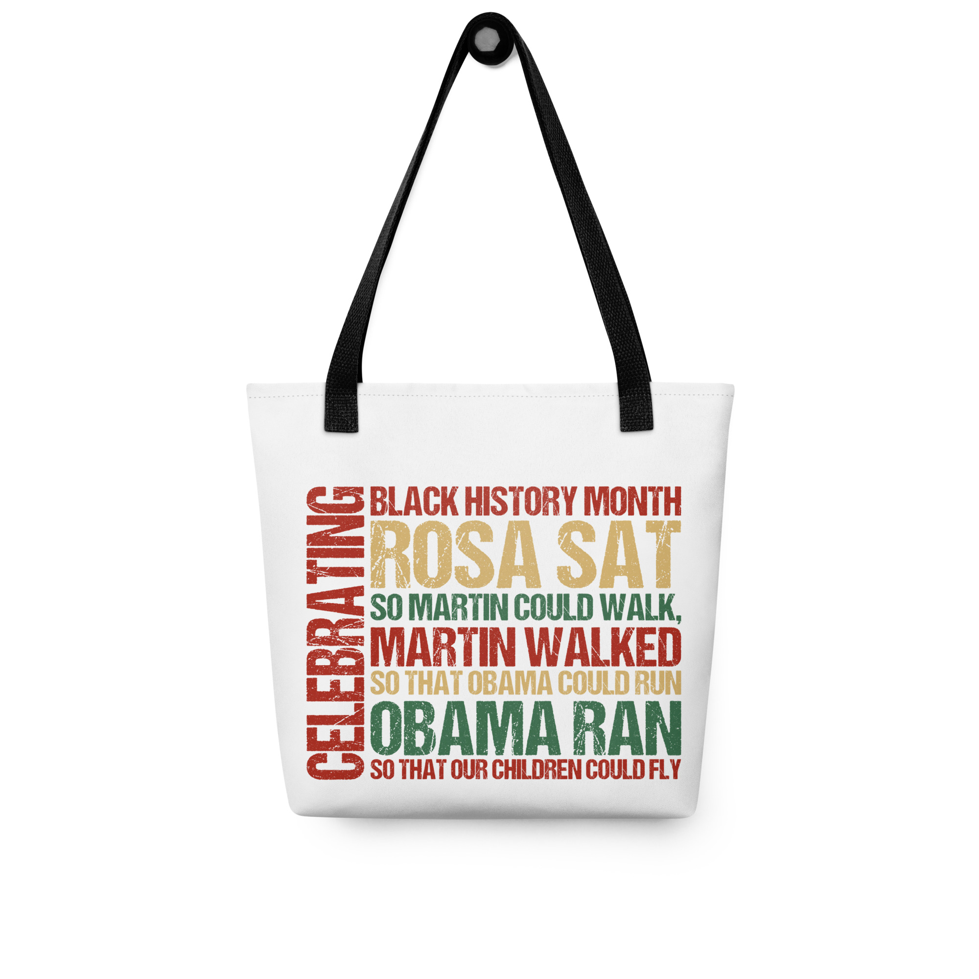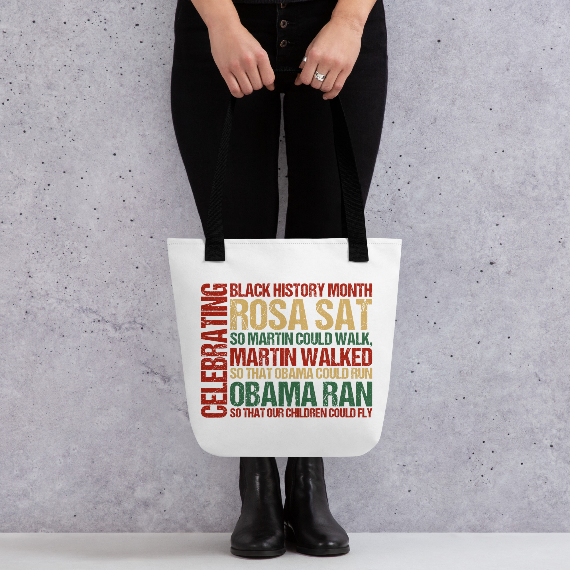 Celebrating Black History Month: Rosa Sat, Martin Walked, Obama Ran Tote BagCelebrating Black History Month: Rosa Sat, Martin Walked, Obama Ran Tote Bag