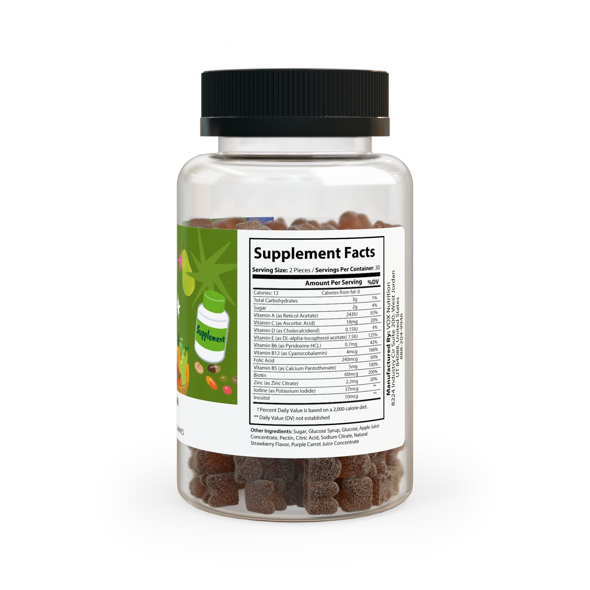 Ingredients: Vitamin A (as Reticol Acetate), Vitamin C (as Ascorbic Acid), Vitamin D (as Cholecalciderol), Vitamin E (as DL-alpha-tocopherol-acetate), Vitamin B6 (as Pyridoxine HCL), Vitamin B12 (as Cyanocobalamin), Folic Acid, Vitamin B5 (as Calcium Pantothenate), Biotin, Zinc (as Zinc Citrate), Iodine (as Potassium Iodide), Inositol. Other Ingredients: Sugar, Glucose Syrup, Glucose, Apple Juice Concentrate, Pectin, Citric Acid, Sodium Citrate, Natural Strawberry Flavor, Purple Carrot Juice Concentrate
